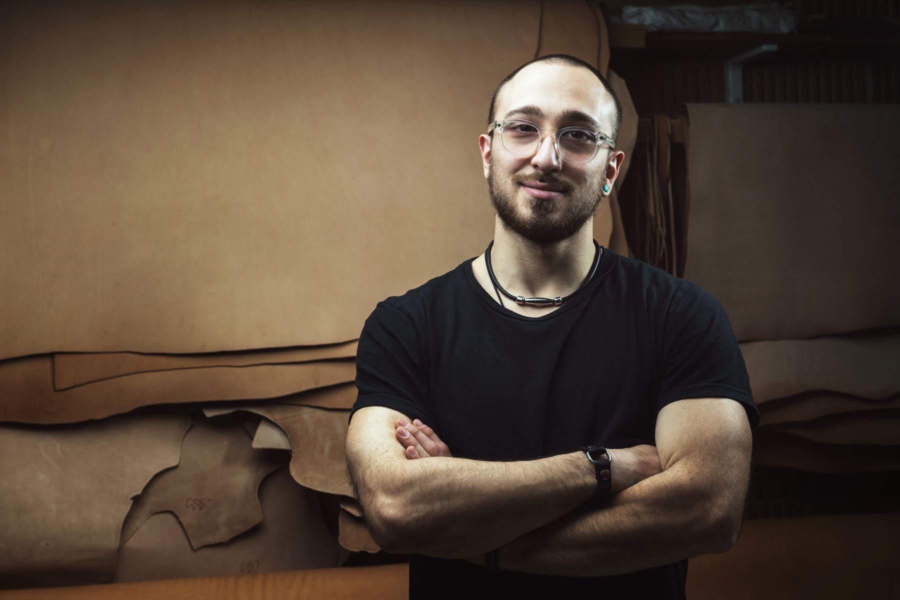 Classe 1996, compie studi artistici che affinano le sue tecniche e lo convincono che lavorare il cuoio sia la giusta strada da intraprendere.